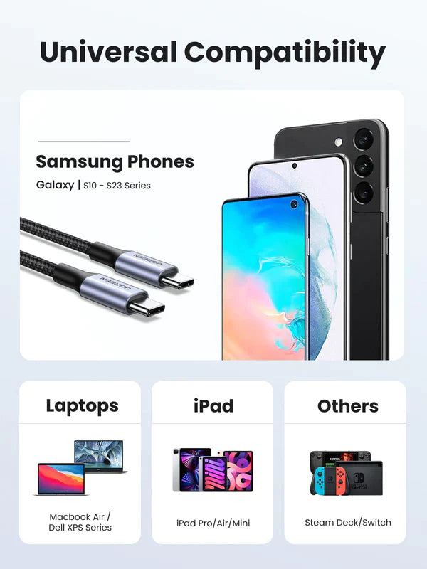 كابل شاحن Ugreen USB-C إلى USB-C 60 واط (مضفر) - 2 متر